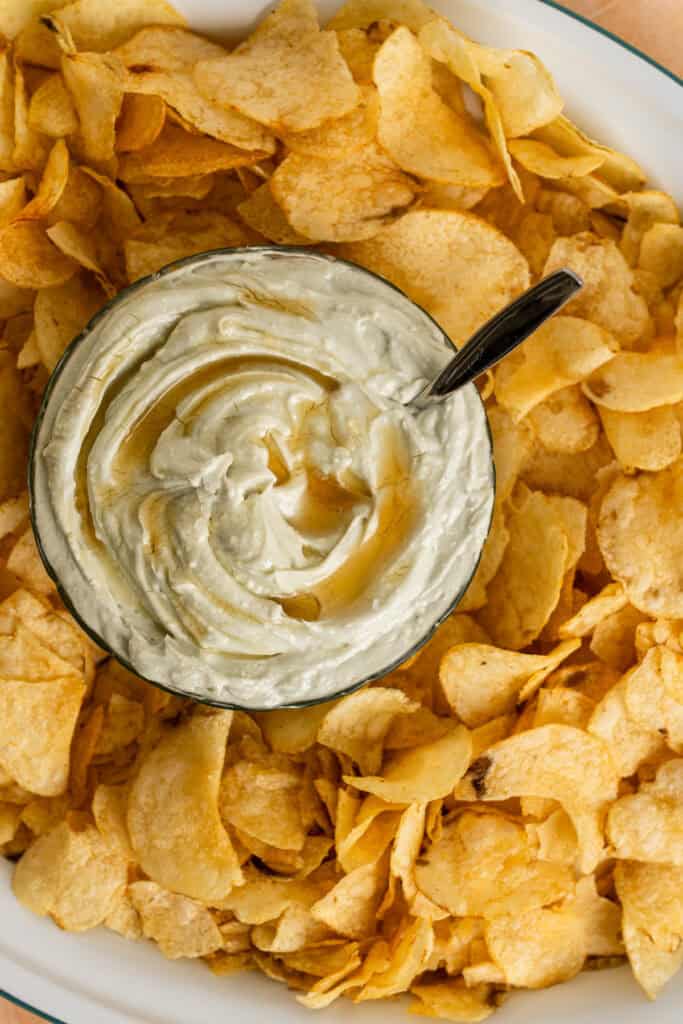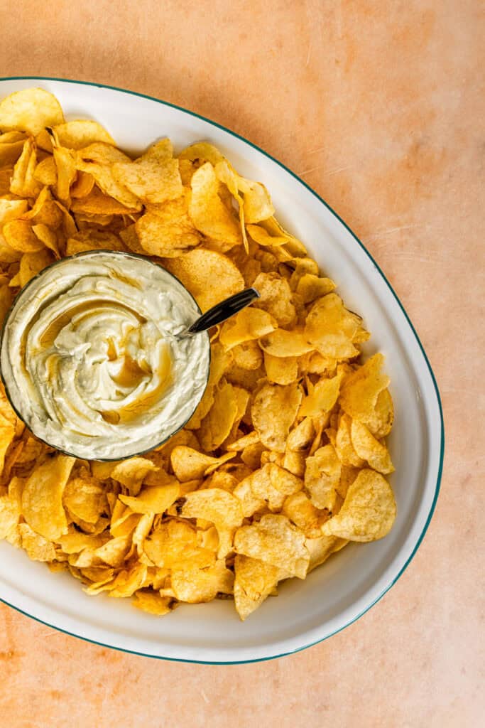 This recipe contains just a few simple ingredients – cave aged blue cheese, cream cheese, salt, honey, and heavy cream. I opted to serve mine with potato chips, and I highly recommend following suit. You could also eat it with baguette or crackers, but the chips are very nice. They feel fun and down to earth, but they also pair perfectly with this slightly sweet and ultra creamy dip. It’s sweet and savory at its finest.